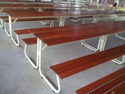 หน้าโต๊ะทำจากไม้เต็ง ขนาด 4 นิ้ว วางเรียงกัน ความกว้างของหน้าโต๊ะไม่น้อยกว่า 70 ซม.ส่วนเก้าอี้ ใช้ไม้เต็ง ขนาด 4 นิ้ว.วางเรียงกัน เช่นเดียวกับหน้าโต๊ะ ขนาดของเก้าอี้ 30x180x75 ซม.ความกว้างของหน้าเก้าอี้ ไม่น้อยกว่า 30 ซม.