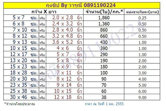 ถุงซิปล็อค พลาสติกเนื้อ PE อย่างดี ซีลแน่น ล็อคสนิท ใส่ของได้สารพัดตามต้องการ มีทุกขนาด ตั้งแต่ใส่แหวนวงเล็กๆ จนถึงหนังสือเล่มโตๆ -กรณีซื้อเบอร์เดียวยกกิโลจะถูกมากค่ะ เบอร์เดียว กิโลกรัมละ 160 บาท ค่าจัดส่ง 40 บาท เบอร์เดียว แบ่งครึ่งกก. 85 บาท ค่าจัดส่ง 25 บาท -หากใช้หลายเบอร์คละกัน เราแบ่งขายให้ได้ค่ะ คละเบอร์ กิโลกรัมละ 200 บาท ค่าจัดส่ง 40 บาท คละเบอร์ แบ่งครึ่งกก. 100 บาท ค่าจัดส่ง 25 บาท -หากใช้น้อยมากๆ หยิบเป็นใบๆ ก็ยินดี ราคาตามตารางเลยค่ะ ค่าจัดส่งเริ่มต้น 20 บาท สนใจติดต่อ วารุณี 0891190224 email [email protected]
