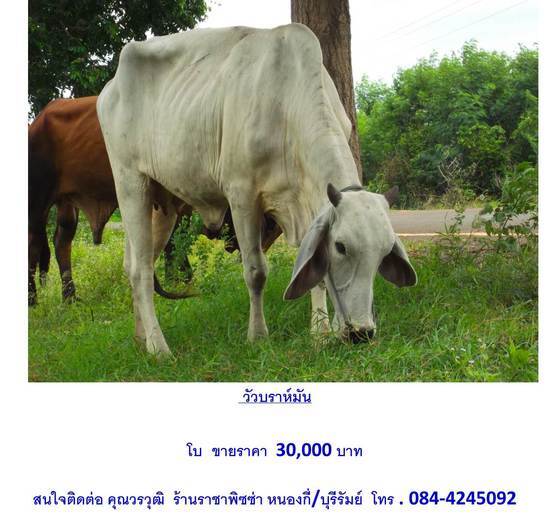 โบ วัวงามบราห์มัน ขายราคา 30,000 บาท สนใจติดต่อคุณวรวุฒิ ร้านราชาพิซซ่า ตลาดหนองกี่ จ.บุรีรัมย์ 31210 โทร. 084-4245092