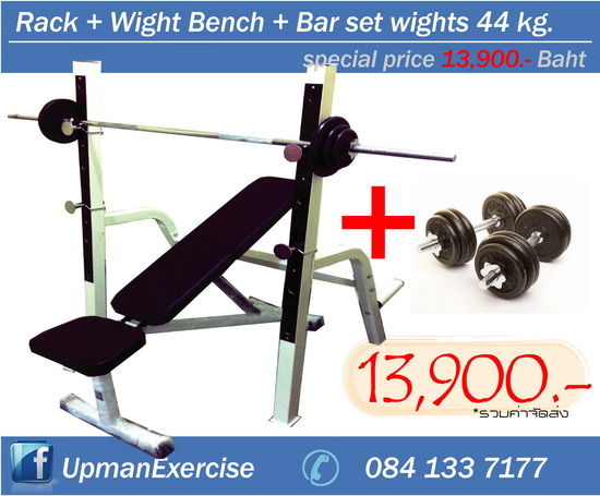 ม้านอนยกน้ำหนักและแร็คสำหรับยกบาร์เบลล์ พร้อมเซ็ทบาร์ยกน้ำหนัก 44 กิโล