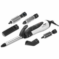 เครื่องม้วนผมไฟฟ้า ให้คุณทำผมได้หลากหลายสไตล์ ด้วยชุดหัวอุปกรณ์เสิรมทั้งหมด 6 แบบ อาทิ หัวบังคับลมไดร์เป่าผมแบบปากแบน แท่งม้วนผมแบบปากคีบ แปรงม้วนผมขนาดเล็ก-ใหญ่ แปรงหวีแบบครึ่งซีก และแปรงม้วนผมขนาดกลางปรับซี่หวีได้ ปรับระดับความร้อนได้ถึง 2 ระดับ พร้อมปุ่มปรับลมเย็น กำลังไฟ 950 วัตต์ สายไฟฟ้าหมุนรอบตัวเครื่อง