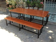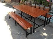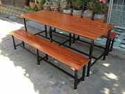 โต๊ะโครงเหล็กพ่นสีดำ หน้าโต๊ะและที่นั่งเป็นไม้สักทอง ทาสีลงชะแลค เคลือบเงาด้วยยูรีเทรน เป็นมันวาวเหมือนกระจก ไม่มีใครทำเหมือน