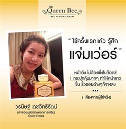 ครีมพิษผึ้ง สูตรพัฒนาล่าสุด ให้ผลลัพท์ที่ดีกว่า สูตรพัฒนาที่เหนือกว่า เข้นข้นกว่า ใส่สารสกัดเต็มพิกัด เนื้อครีมซึมไวเว่อ ลดริ้วรอยด้วยทองคำแท้จากสวิตฯและสเตมเซลล์ กระจ่างใสด้วยวิตามิน C และสารสกัดจากเต้าหู้ญี่ปุ่น สามารถบำรุงผิวหน้าทันที เห็นผลตั้งแต่ครั้งแรกที่ใช้ ผิวดูขาวขึ้น รูขุมขนเล็กลง ริ้วรอย ฝ้า กระ จางลง หมดปัญหา ผิวหยาบกร้าน ไม่สม่ำเสมอ และไร้สารพิษตกค้าง ผ่านการรับรอง อย. 10-1-5633851 ส่วนประกอบหลัก Bee Venom (ครีมพิษผึ้ง) from New Zealand Gold Swiss (ทองคำแท้) from Switzerland Vitamin C (วิตามิน ซี) from Korea Tofu Moritaya (สารสกัดจากโปรตีนถั่งเหลือง) from Japan Stem Cell (สเตม เซลล์) from USA วิธีใช้ ใช้ทาบำรุงทั่วใบหน้าและลำคอ เช้า-ก่อนนอน เป็นประจำ ข้อควรระวัง ห้ามใช้ ครีมพิษผึ้ง กับผู้แพ้เหล็กในผึ้ง และ ทาในบริเวณที่เป็นแผลหรือผิวหนังที่บวมพอง วิธีการเก็บรักษา เก็บ ครีมพิษผึ้ง ในที่เย็นและพ้นแสงแดด ข้อควรแนะนำ ในการใช้ ครีมพิษผึ้ง ครั้งแรก ถ้ายังไม่แน่ใจว่าแพ้หรือเปล่าให้ลองทา ครีมพิษผึ้ง ในปริมาณเล็กน้อยบนส่วนใดส่วนหนึ่งบนใบหน้า ทิ้งไว้ 20 นาที ถ้ามีปฎิกิริยาที่ผิวหนัง เช่น คัน เป็นผื่นแดงหรือบวม ห้ามใช้ ผลิตภัณฑ์นี้