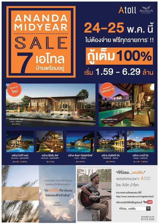 “ไม่ต้องจ่าย ฟรี!!! ทุกรายการ” ที่ Atoll บ้านพร้อมอยู่ 7 โครงการ รอบบางนา-สุวรรณภูมิ โดย บมจ.อนันดา ดีเวลลอปเม้นท์ กับแคมเปญใหญ่ “Ananda Mid Year Sale” 24 – 25 พ.ค.นี้ บริษัท อนันดา ดีเวลลอปเม้นท์ จำกัด (มหาชน) โชว์ศักยภาพโครงการที่ดีที่สุดโซนตะวันออกของกรุงเทพฯ กับบ้านเดี่ยวพร้อมอยู่ ภายใต้แบรนด์ “เอโทล”(Atoll) 7 โครงการ ในสไตล์ Modern Resort Living พร้อมข้อเสนอสุดพิเศษเฉพาะวันงาน “ไม่ต้องจ่าย ฟรี!!! ทุกรายการ” แคมเปญ “Ananda Mid Year Sale” จัดโปรโมชั่นสุดพิเศษสำหรับลูกค้าคนสำคัญ “ไม่ต้องจ่าย ฟรี!!! ทุกรายการ” “รับส่วนลดเพิ่มสูงสุด 100,000 บาท”* (เมื่อลงทะเบียนผ่าน www.ananda.co.th) นอกจากนี้ยังได้รับความไว้วางใจจากสถาบันการเงินชั้นนำระดับประเทศที่นำข้อเสนอที่ดีที่สุดทางการเงิน กู้เต็ม 100% อาทิ ธนาคารกรุงไทย ธนาคารกรุงศรี ธนาคารยูโอบี ธนาคารออมสินและธนาคารอาคารสงเคราะห์ เป็นต้น ด้วยราคาเริ่มต้นที่ 1.59 – 6.29 ล้านบาท (เงื่อนไขเป็นไปตามที่บริษัทฯกำหนด) กับบ้านเดี่ยวคุณภาพเยี่ยมพร้อมอยู่ภายใต้แบรนด์ “เอโทล” 7 โครงการ บนทำเลศักยภาพ ใกล้สิ่งอำนวยความสะดวกครบครัน ได้แก่ เอโทล จาวา เบย์ บางนา – กิ่งแก้ว 19 รูปแบบการใช้ชีวิต สไตล์โมเดิร์น รีสอร์ท คุ้มที่สุดกับทุกตารางเมตร เริ่มต้น 3.29 ล้านบาท เอโทล มัลดีฟส์ ปาล์ม บางนา – วงแหวน โอกาสสุดท้ายก่อนปิดโครงการกับบ้านใหญ่ 165 ตร.ม. ในราคาพิเศษสุด 4.99 ล้านบาท เอโทล สิมิลัน รีฟ พระราม 9 – กรุงเทพกรีฑา บ้านเดี่ยวสไตล์รีสอร์ท ที่คุ้มค่า คุ้มราคา ขนาด 50 ตร.ว. เริ่ม 3.3 ล้านบาท เอโทล ไวกีกิ ชอร์ พระราม 9 – กรุงเทพกรีฑา พิเศษกับบ้านใหม่ โซนติดสวน สไตส์ฮาวาย เริ่ม 4.59-6.29 ล้านบาท เอโทล ลันตา รีสอร์ทไลฟ์ บางนา – วงแหวน บ้านเดี่ยวล๊อตสุดท้าย ท้ายสุด บ้านสไตส์โมเดิร์น รีสอร์ท เริ่ม 1.39 ล้านบาท เอโทล มัลดีฟส์ บีช ศรีนครินทร์ – วงแหวน บ้านที่ให้ความสุข เหมือนได้พักผ่อนทุกวันที่มัลดีฟส์ โซนใกล้สวน ราคาเดียว เริ่ม 2.59 ล้านบาท เอโทล บาหลี บีช อ่อนนุช – ลาดกระบัง บ้านทำเลดี สุดคุ้ม ด้วยพื้นที่ส่วนกลางและคลับเฮ้าส์กว่า 4 ไร่ เริ่ม 1.59 - 4.89 ล้านบาท