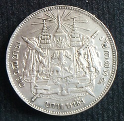 เหรียญเงินร.5 หนึ่งบาท ด้านหลังตราแผ่นดิน สภาพสวย