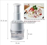เครื่องสับกระเทียม หั่นผัก หั่นพริก ตัวเครื่องผลิตจากพลาสติกเกรด ABS ใบมีดทำจากสแตนเลส ใช้งานง่าย เพียงแต่ครอบผักหรือกระเทียม แล้วกดๆๆๆๆ ผักหรือกระเทียมก็จะละเอียด ล้างทำความสะอาดง่าย