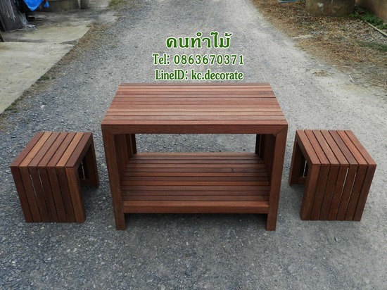 ชุดโต๊ะไม้ระแนง ชิ้นงานทำจากไม้มะค่าแดง โครงสร้างไม้จริงเนื้อแข็ง งานแข็งแรง สวย ขัดไม้เรียบเนียน ตัวโต๊ะออกแบบมา 2 ชั้นเพื่อการใช้งานที่คุ้มค่า นอกจากนี้เรายังรับผลิตเฟอร์นิเจอร์ โต๊ะไม้ ม้านั่งสนาม ฯลฯ ตามออเดอร์ ชมผลงานเพิ่มเติมได้ที่ facebook/kontammai chayatorn หรือ Line ID: kc.decorate