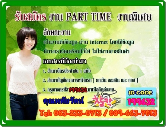 หางานทำ นอกเวลา งานพาร์ทไทม์ สร้างอาชีพเสริมรายได้ งานทำเสาร์ อาทิตย์ หางานรายได้พิเศษ รายได้เสริม@home งานปี 2558 Part time ทำที่บ้าน เหมาะสำหรับ นิสิตนักศึกษา คนว่างงาน คนท้อง แม่บ้าน พนักงานบริษัท และผู้ที่ต้องการ หางานพิเศษทำที่บ้านได้ งาน part time เสาร์อาทิตย์ ทำเวลาว่าง ตอนเย็น วันหยุด ระหว่างเรียน หลังเลิกงาน เป็นงานพิเศษ รายได้เสริม เพียงแค่มีคอมพิวเตอร์ Internet ก็สามารถสร้างรายได้พิเศษจากที่บ้านได้ ทำงานวันละ 2-3 ชม./วัน งานพิเศษผ่านอินเตอร์เน็ท Online ไม่จำกัดวันและเวลาทำงานสามรถทำ งานพิเศษที่บ้านได้ รายได้ดี ต้องการรับด่วน!!