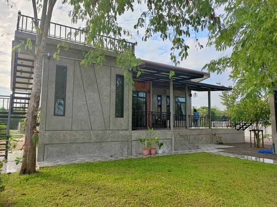 - บ้านชั้นเดียวสไตล์รีสอร์ท ดาดฟ้านั่งเล่นได้ สร้างครัวห้องทานอาหารกาแฟอีก1 หลัง ด้านหน้าตัวบ้าน