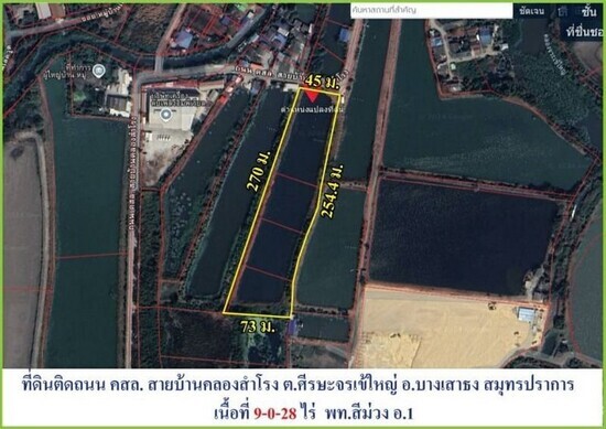 ขายถูกที่ดินผังสีม่วง ถนนบางนาตราด กม.21ขาออก(เนื้อที่ 9-0-28 ไร่ ขายไร่ละ 6.5 ล้าน) ศรีษะจรเข้ใหญ่ บางเสาธง สมุทรปราการ