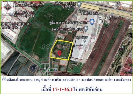 ขายถูกที่ดิน ถ.บางนา-ตราด กม.35 ขาเข้า (เนื่อที่รวม 17-1-36 ไร่ ขายไร่ละ 7 ล้านบาท) บางสมัคร บางปะกง ฉะเชิงเทรา