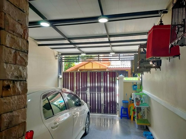 ลักษณะบ้าน : ทาวน์เฮ้าส์ 2 ชั้น มีระเบียง ต่อเติมห้องครัวด้านหลัง ติดตั้งมุ้งลวด