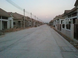 ตัวบ้าน ทำด้วยอิฐมอญแดง กระเบื้องแผ่นใหญ่ มีฟอยกันความร้อนบนหลังคา ถนนหน้าโครงการ กว้างมาก