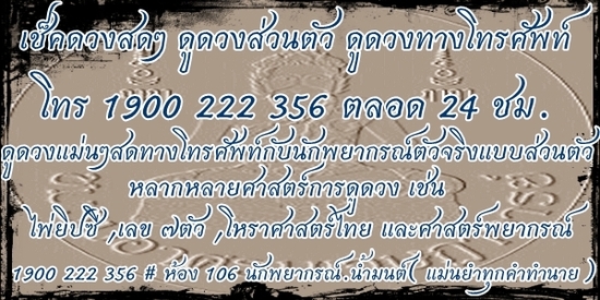 เช็คดวงสด เช็คดวงส่วนตัว เช็คดวงทางโทรศัพท์ เช็คดวงแม่นๆสดทางโทรศัพท์กับนักพยากรณ์ตัวจริงแบบส่วนตัว โทร 1900 222 356 ตลอด 24 ชม.